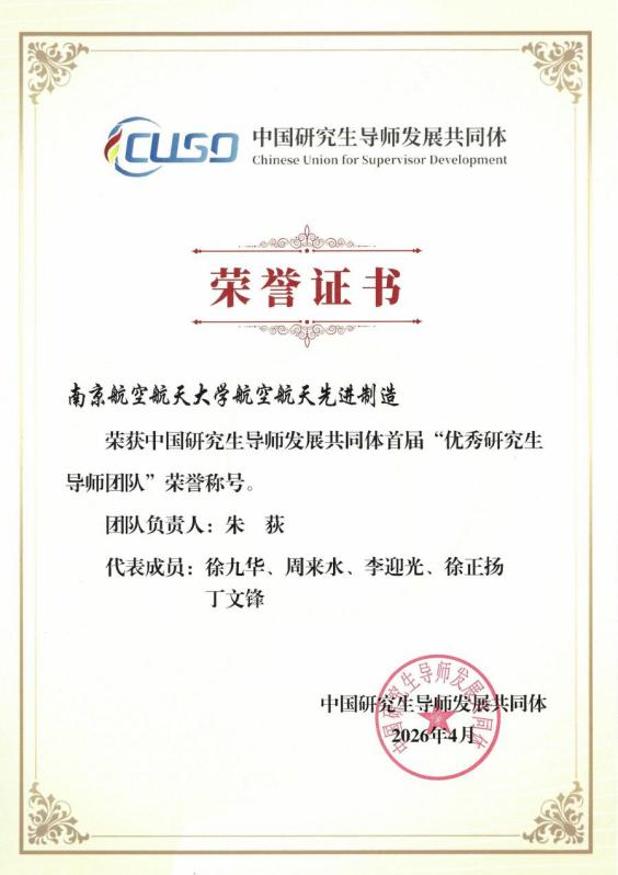 近日,中国研究生导师发展共同体组织开展首届优秀导师与团队评选工作,经单位推荐、材料审核、专家函评、会议评审,我校“航空航天先进制造团队”入选首届优秀研究生导师团队(负责人:朱荻院士)。