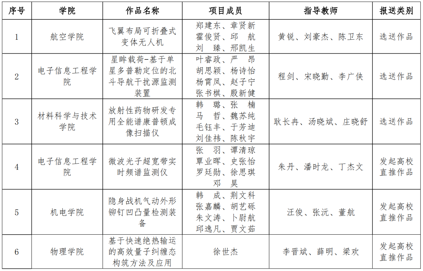 根据第十九届“挑战杯”全国大学生课外学术科技作品竞赛组委会的要求,经过校内选拔赛、江苏省选拔赛等环节,拟报送“飞翼布局可折叠式变体无人机”等6件作品参加第十九届“挑战杯”全国大学生课外学术科技作品竞赛国赛,具体名单如下,现予以公示: